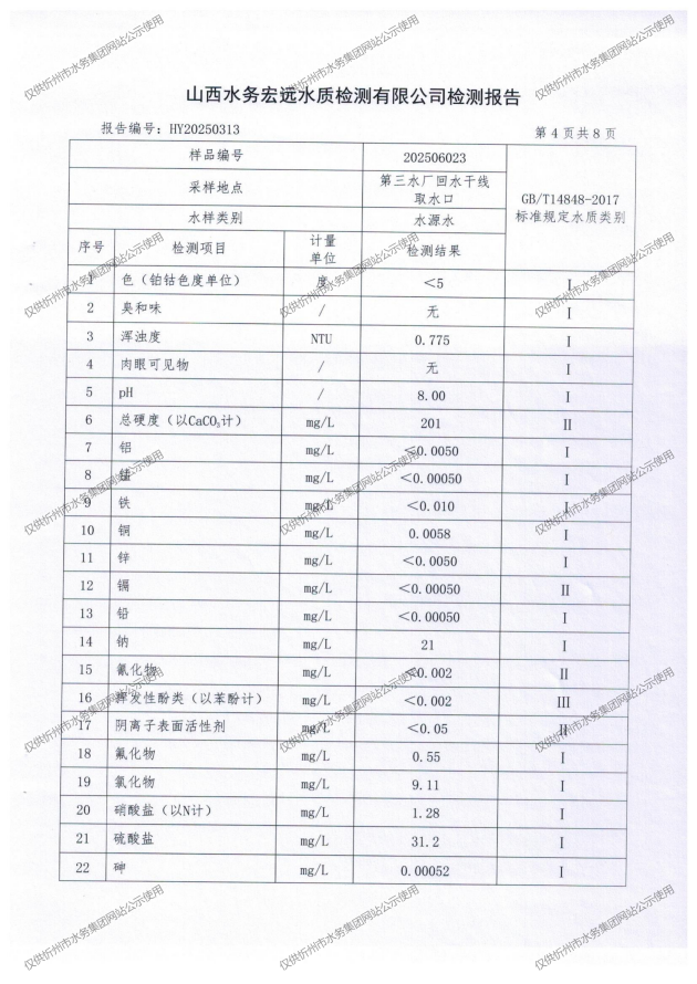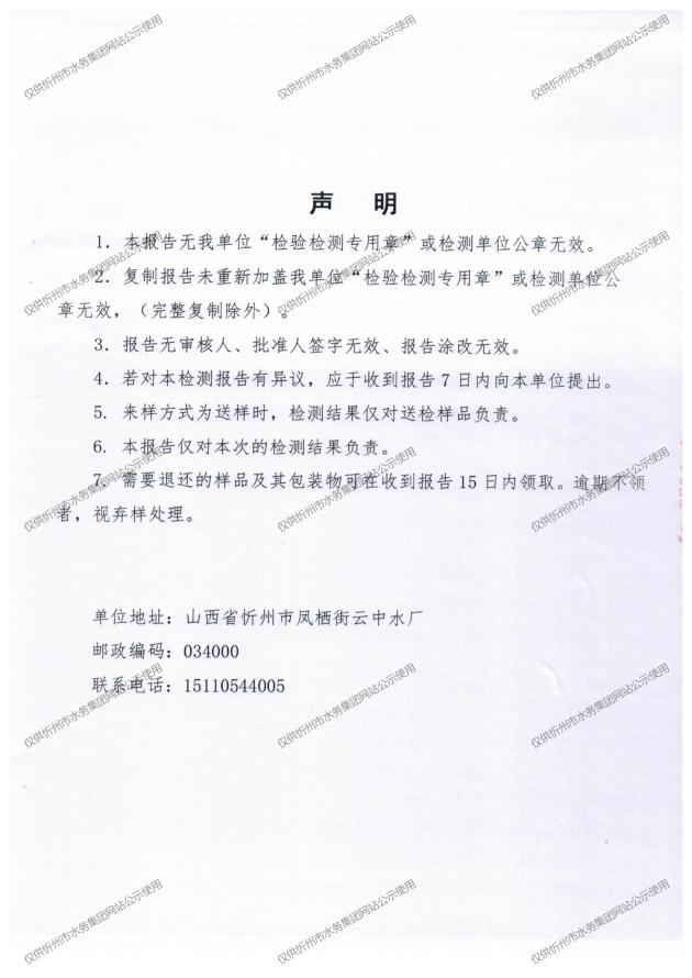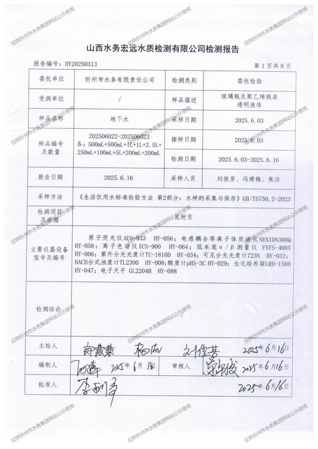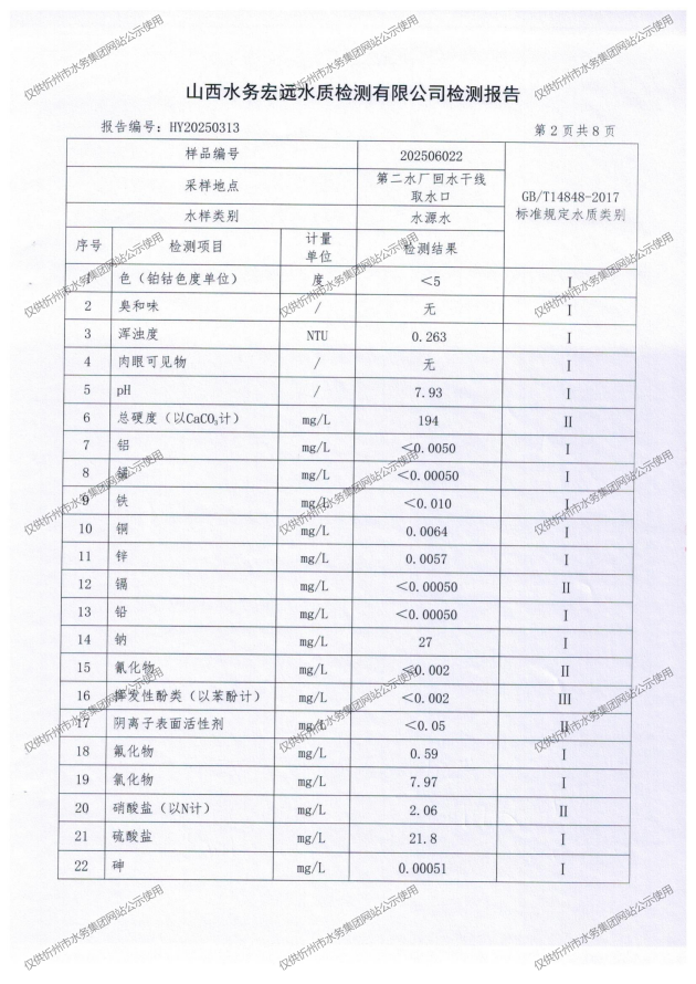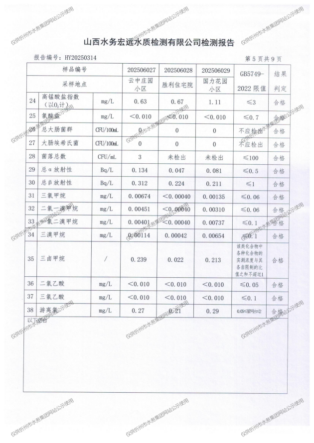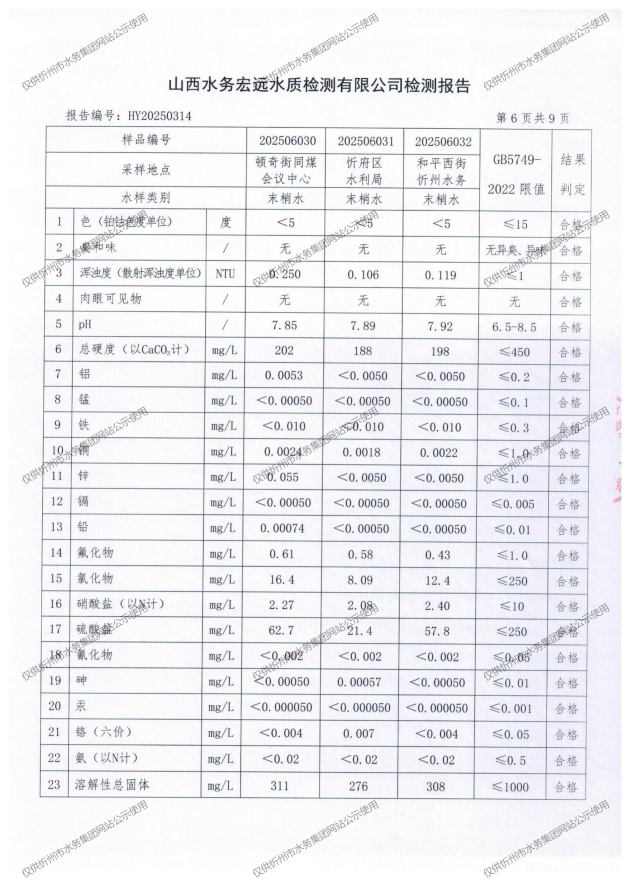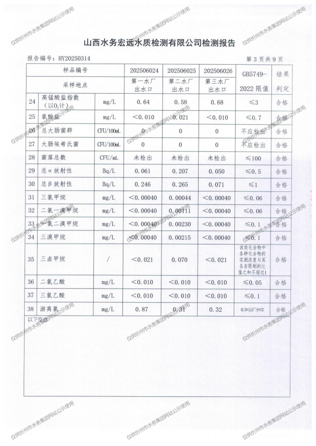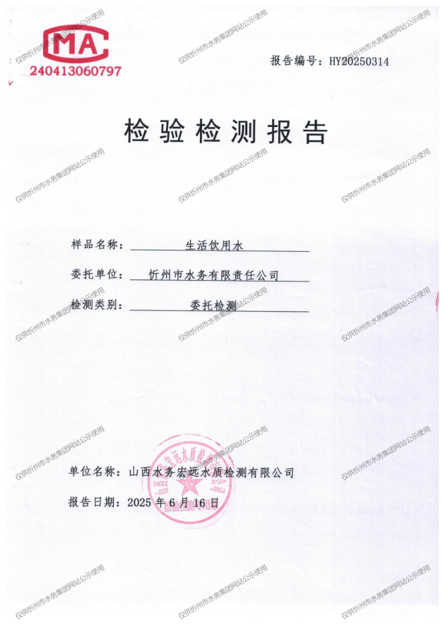 忻州城區(qū)公共供水水源水、出廠水、管網水、管網末梢水2025年6月份水質信息公示