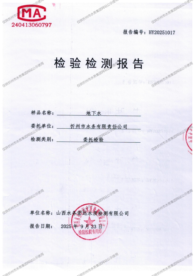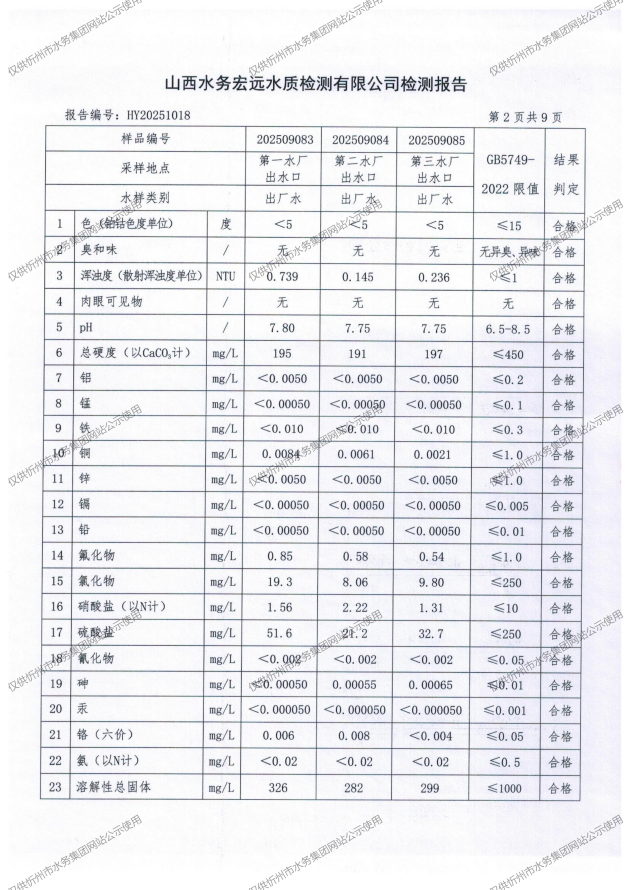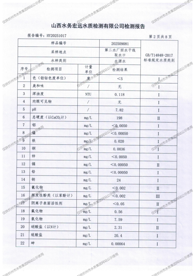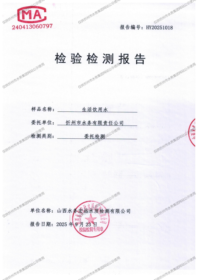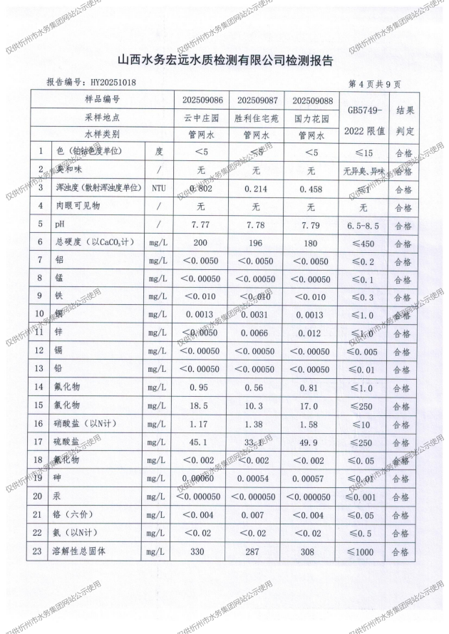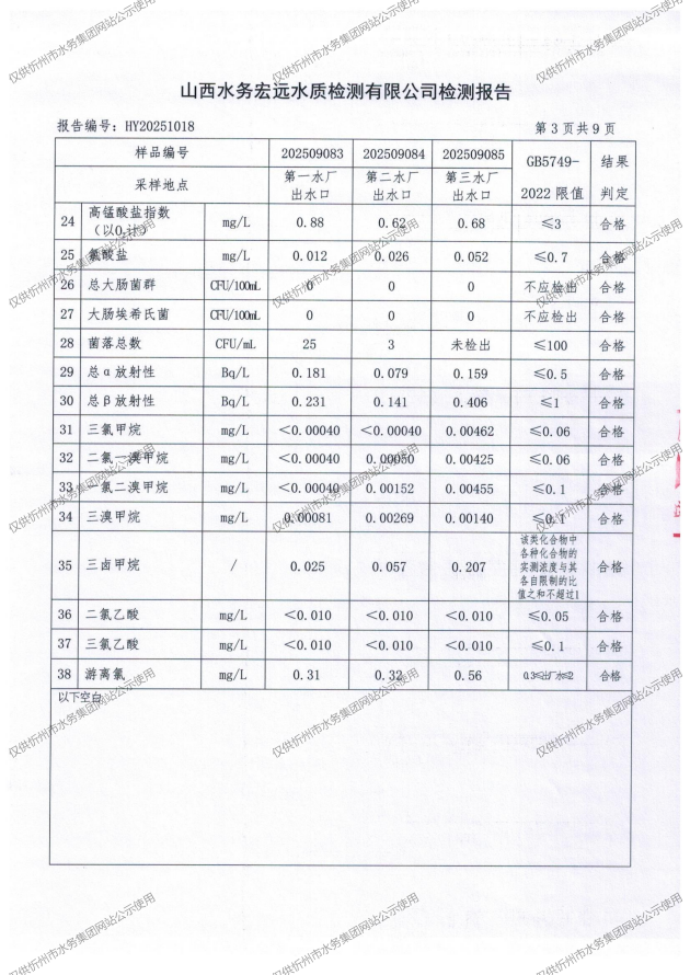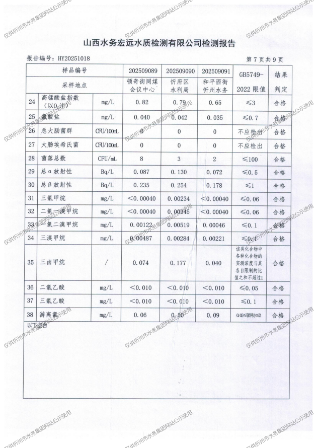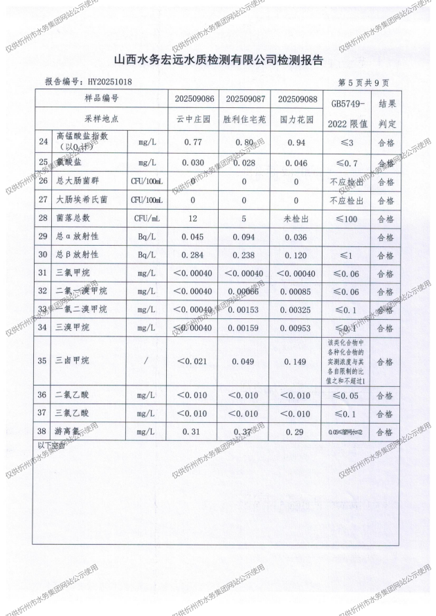 忻州城區(qū)公共供水水源水、出廠水、管網水、管網末梢水2025年9月份水質信息公示