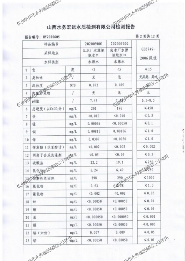 忻州城區(qū)公共供水水源水、出廠水、管網水、管網末梢水2020年9月份水質信息公示