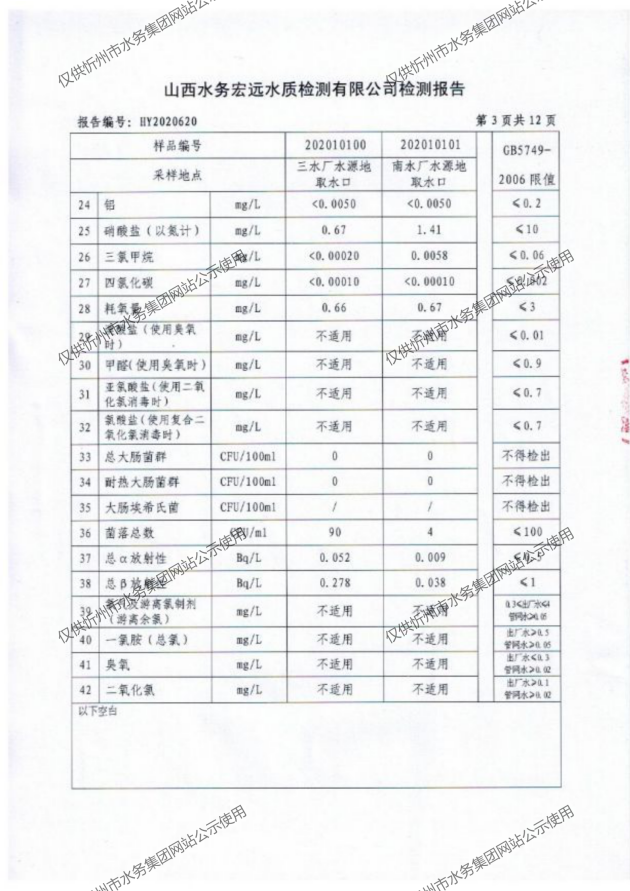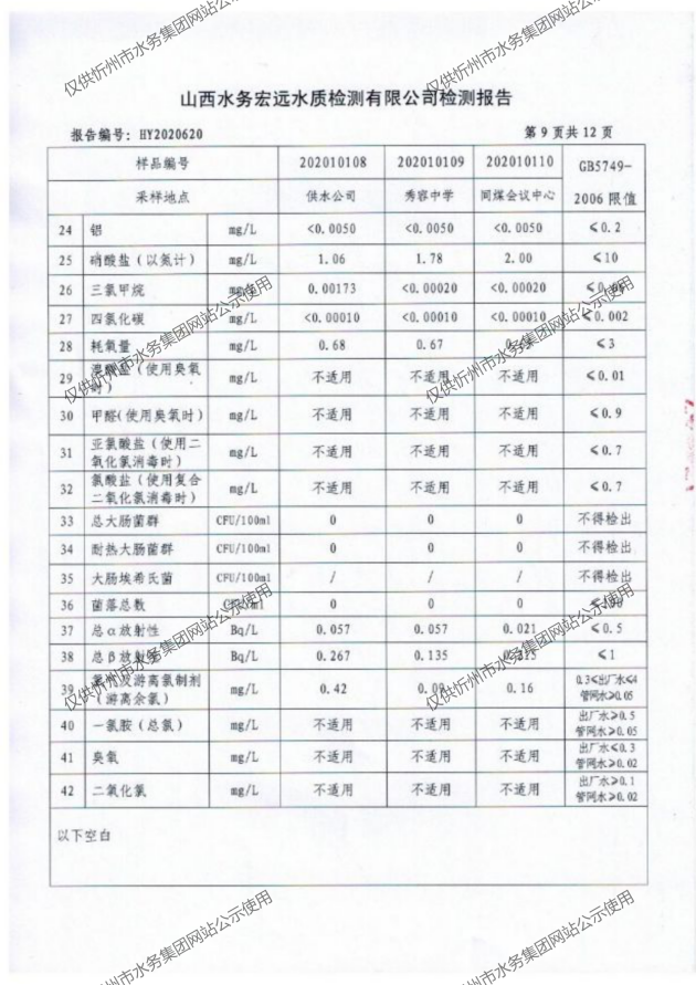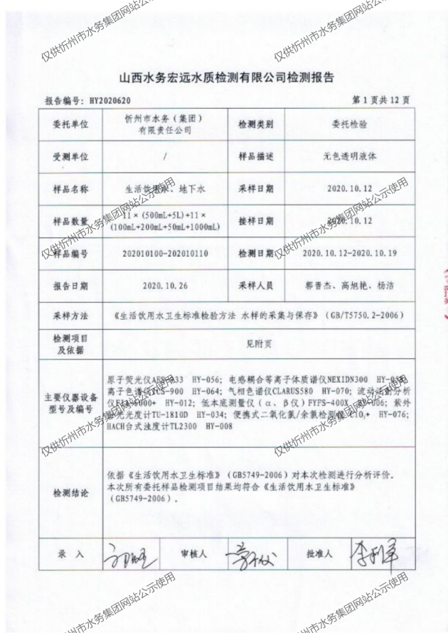 忻州城區(qū)公共供水水源水、出廠水、管網水、管網末梢水2020年10月份水質信息公示